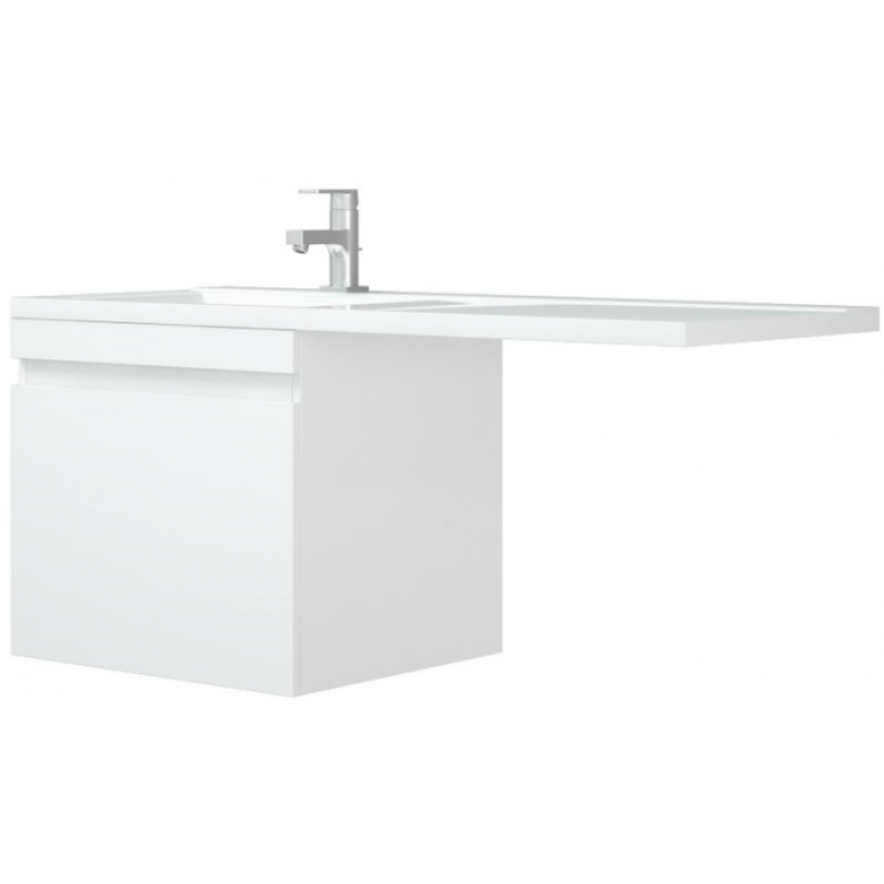 Тумба оснащена двумя выдвижными ящиками. Первый ящик имеет большой внешний фасад без ручки, так как есть специально сделанная фрезеровка для открывания. Ящик высотой 70 мм, оснащен направляющими скрытого монтажа с доводчиками. Второй ящик можно открыть только тогда, когда открыт большой ящик. Второй ящик оснащен направляющими типа "push-to-open", что означает следующее - фасад открывается при нажатии. Направляющие второго ящика - с доводчиками. Ящик высотой 70 мм. Оснащен выпилом под коммуникации. Тумба к стене крепится с помощью подвесов "Scarpi", которые входят в комплект. Фасадная часть и боковины - в эмали.