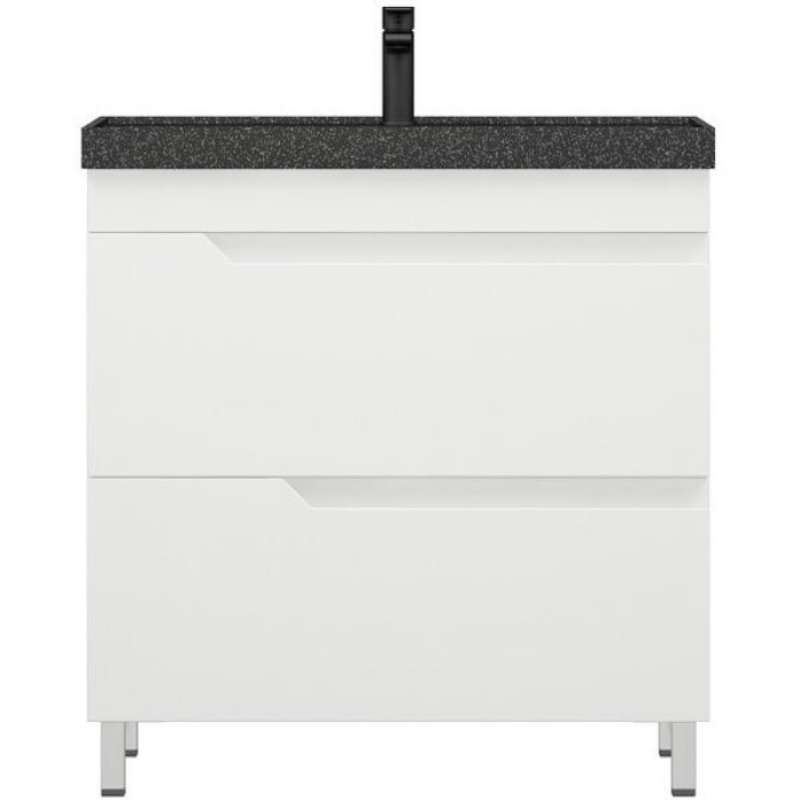 Тумба "Юрма" оснащена двумя выдвижными ящиками. Ящики на направляющих скрытого монтажа 350 мм с доводчиками. Фасады без ручек - есть специально сделанная фрезеровка для открывания. Верхний ящик высотой 135 мм с выпилом под коммуникации, нижний высотой 135 мм. 4 хромированные опоры на 100 мм. Фасадная часть и боковины покрашены в глянцевую белую эмаль. Увеличенная толщина фасада до 19 мм. Корпус - ЛДСП 16 мм белый.