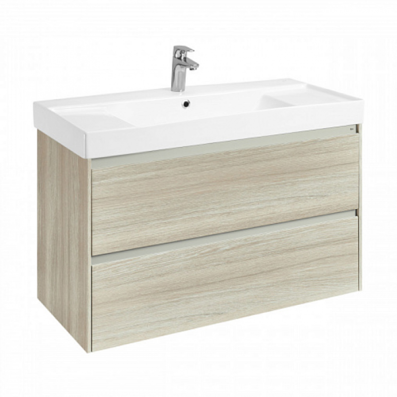 Удобная металлическая профильная ручка во всю ширину модуля обеспечивает легкость открывания ящиков и защиту фасадов от влаги, ударов и износа.  В обоих ящиках находятся противоскользящие коврики, а верхний ящик снабжен также встроенной организацией пространства – эстетика и идеальный порядок в ванной комнате. Комфортное и долговременное использование мебели гарантировано благодаря направляющим Hettich полного выдвижения и плавного открывания и закрывания, протестированных на 60 000 циклов.Тип: тумба под раковинуНазначение: для ванной комнатыМонтаж: подвеснойТип установки: настенныйФорма: прямоугольнаяРазмер тумбы (ШхВхГ): 985х450х565 мм  Система хранения: выдвижные ящикиМатериал корпуса: ВЛДСП, МДФМатериал фасада: МДФПокрытие корпуса: пленка матоваяПокрытие фасада: пленка матоваяЦвет:  светлый дуб