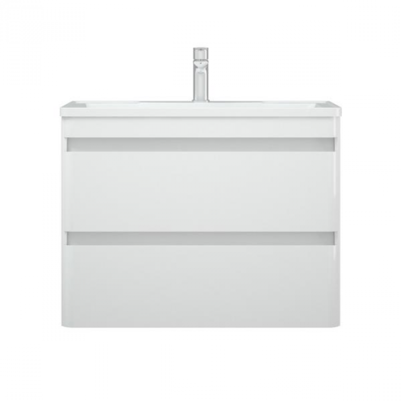 Подвесная тумба имеет интересный эргономичный дизайн - скругление боковин плавно переходит в скругления на фасадах. У тумбы 2 выдвижных ящика на направляющих скрытого монтажа с доводчиками. Нижний ящик цельный, верхний разделен на 2 отделения, с местом под коммуникации посередине. Верхний ящик высотой 100 мм с выпилом под коммуникации, нижний высотой 170 мм. Коромысло, боковины, фасады - МДФ в плёнке. Фасады не имеют ручек, конструктив тумбы позволяет открывать фасады без использования ручек.