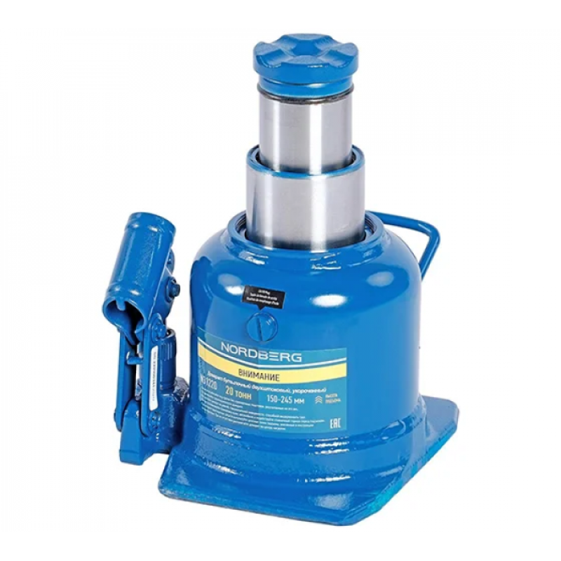 Бутылочные домкраты отличаются компактностью конструкции, простотой обслуживания и надежностью в эксплуатации.Плавный подъем груза при небольшом рабочем усилии благодаря высокому передаточному отношению между площадями поперечного сечения цилиндра и плунжера насоса.Не требуют при работе использования вспомогательных приспособлений.Данные домкраты могут использоваться в качестве рабочего элемента в более сложных устройствах, таких как прессы, трубогибы и других, где рабочий элемент располагается вертикально.Технические характеристики    Тип привода гидравлическийГрузоподъемность 20 тВысота подхвата 150 ммВысота подъема 245 ммКоличество штоков 2Рабочий ход 95 ммМатериал корпуса металлДиаметр опоры 60 ммТелескопический даПредохранительный клапан даРучка для переноски даДлина рукояти 570 ммВес нетто 11.2 кгРазмер основания 190х170 мм