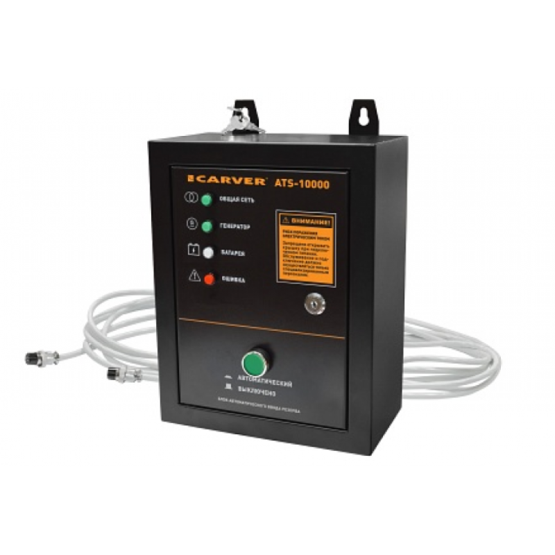 Автомат ввода резерва Carver ATS-10000 предназначен для автоматического запуска резервного электрогенератора и обеспечения подачи электроэнергии к потребителю в случае отключения основного сетевого питания.Данный блок предназначен исключительно для использования с бензиновыми генераторами Carver оборудованных разъемом подключения блока АВР (ATS) типа DF20-3. Использование с другими моделями генераторов или моделями не имеющими данной функции недопустимо.Технические характеристикиМакс. коммутируемая мощность – сеть, кВт:10Макс. коммутируемая мощность – генератор, кВт:10Соединительный сигнальный провод, м:5Разъем для подключения:DF20-3Коммутируемых фаз:1/3Макс. напряжение коммутации, В:400Устройство коммутации:Электромагнитный переключатель, 2 штНапряжение катушки управления, В:230Максимальный ток зарядного устройства, А:1Степень защиты:IP31Материал шкафа:СтальТип крепления:НавеснойОтверстия ввода:снизуКлиматическое исполнение:УХЛЗДиапазон рабочих температур:от –10 до +40°СГабариты упаковки, см:40 х 32,5 х 20Вес нетто / брутто, кг:4,7 / 5,35