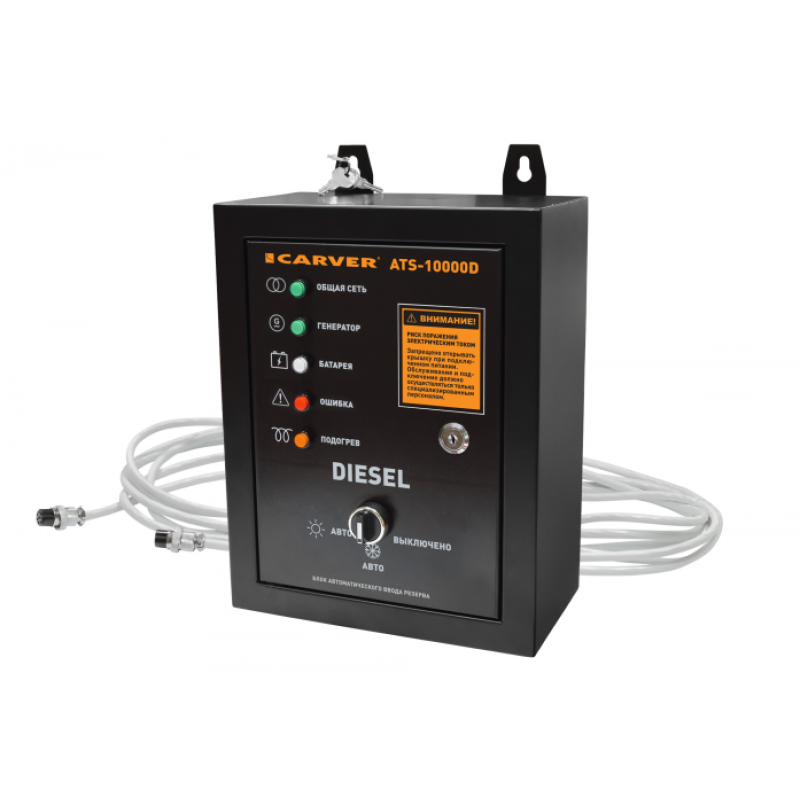 Автомат ввода резерва Carver ATS-10000D предназначен для автоматического запуска резервного электрогенератора и обеспечения подачи электроэнергии к потребителю в случае отключения основного сетевого питания.Данный блок предназначен исключительно для использования с дизельными генераторами Carver оборудованных разъемом подключения блока АВР (ATS) типа DF20-8. Использование с другими моделями генераторов или моделями не имеющими данной функции недопустимо.Технические характеристикиМакс. коммутируемая мощность – сеть, кВт:10Макс. коммутируемая мощность – генератор, кВт:10Соединительный сигнальный провод, м:5Разъем для подключения:DF20-8Коммутируемых фаз:1/3Макс. напряжение коммутации, В:400Устройство коммутации:Электромагнитный переключатель, 2 штНапряжение катушки управления, В:230Максимальный ток зарядного устройства, А:1Степень защиты:IP31Материал шкафа:СтальТип крепления:НавеснойОтверстия ввода:снизуДиапазон рабочих температур:от –10 до +40°СГабариты упаковки, см:40 х 32,5 х 20Вес нетто / брутто, кг:4,7 / 5,35