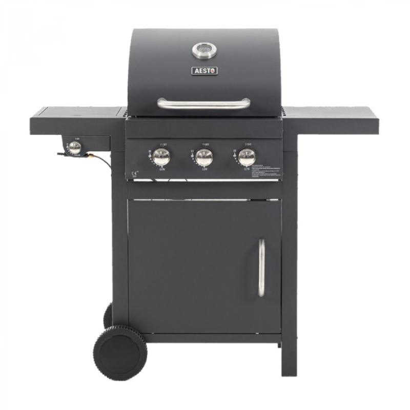 •    Размер: 106х50х100 см•    Высота до жаровни: 86,5 см•    Материал: сталь с порошковым покрытием•    Решетка для приготовления: 51,5х33,5 см•    Материал: чугун с эмалевым покрытием•    3 горелки из нержавеющей стали•    Мощность: 7,5 кВт•    Давление газа: 28-30/37 мбар•    Максимальный расход газа: 182 г/ч каждая горелка•    Топливо: сжиженный пропан-бутан•    Тип розжига: пьезорозжиг•    Максимальная температура: 550°С•    Термометр•    Колеса: 2 шт.•    Защита горелок от жира•    Жиросборник•    Укротитель пламени•    Открывалка для бутылок•    Боковые столики 2 шт. + 2 крючка•    Регулятор и шланг 80 см в комплекте•    Вес нетто: 19,2 кг•    Вес брутто: 20,6 кг•    Размер коробки: 57x46x37 см•    Производитель: AESTO•    Страна: Китай