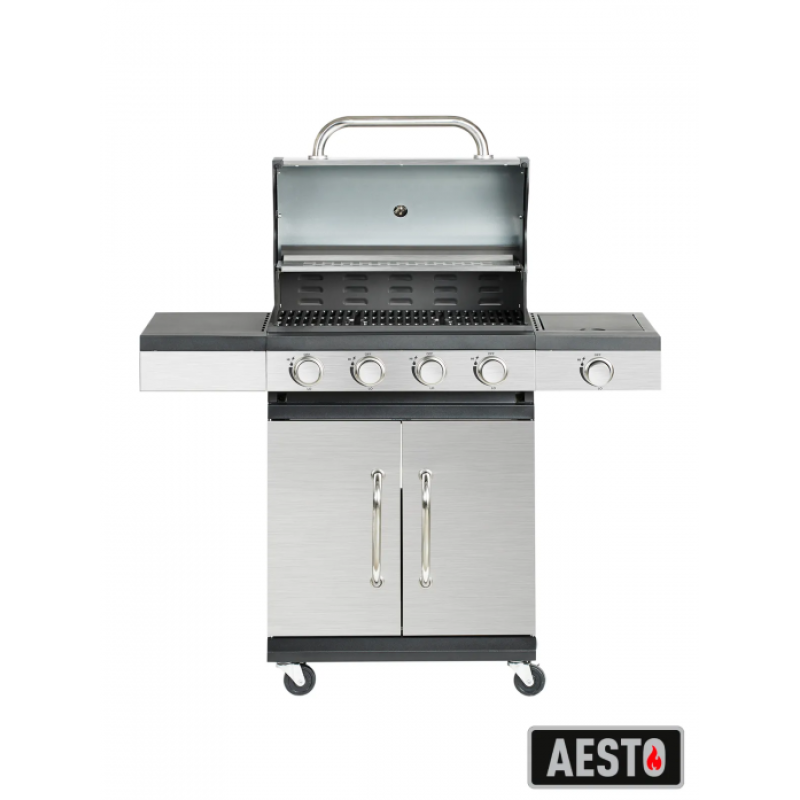 • Размер: 120х48х110 см  • Высота до жаровни: 86,5 см  • Материал: нержавеющая сталь, сталь с порошковым покрытием  • Решетка для приготовления: 61,5х37,5 см  • Материал: чугун с эмалевым покрытием  • 4 основных горелки + 1 боковая горелка  • Материл: нержавеющая сталь  • Мощность: 11,2 кВт + 2,5 кВт  • Давление газа: 28-30/37 мбар  • Максимальный расход газа: 204 г/ч каждая горелка, боковая - 182 г/ч  • Топливо: сжиженный пропан-бутан  • Тип розжига: пьезорозжиг  • Максимальная температура: 550°С  • Термометр • Колеса: 4 шт.  • Защита горелок от жира  • Жиросборник  • Укротитель пламени  • Боковые столики 2 шт. с  • Регулятор и шланг 80 см в комплекте  • Вес нетто: 32 кг  • Вес брутто: 34 кг  • Размер коробки: 75х59х54 см    • Производитель: AESTO  • Страна: Китай